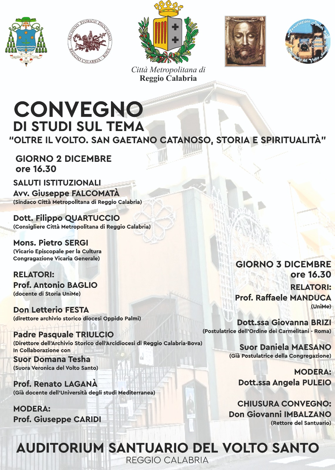 Il seminario di studi sul tema “Oltre il volto. San Gaetano Catanoso, storia e spiritualità” si aprirà il giorno seguente, a partire dalle ore 16:30, con i saluti istituzionali del sindaco metropolitano Giuseppe Falcomatà, del consigliere delegato Filippo Quartuccio e di monsignor Pietro Sergi, vicario episcopale della Congregazione Vicaria Generale.